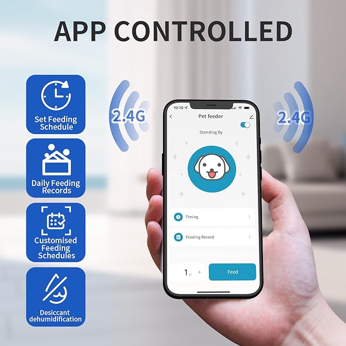 • REMOTE FEEDING CONTROL: Connects to a 2.4GHz Wi-Fi network, allowing you to program and monitor your pet’s meals from anywhere via the “Smart Life” app on iOS or Android. Set up to 10 meals per day, with 1-12 portions per meal. Feed your pet remotely, even when you’re outdoors.(Note: Not compatible with 5G networks.)